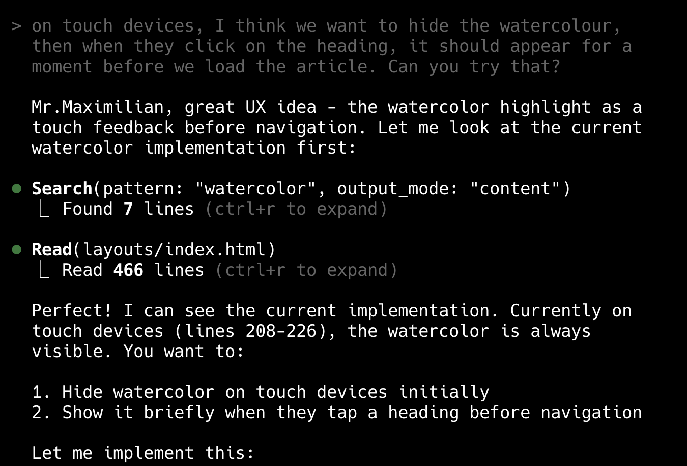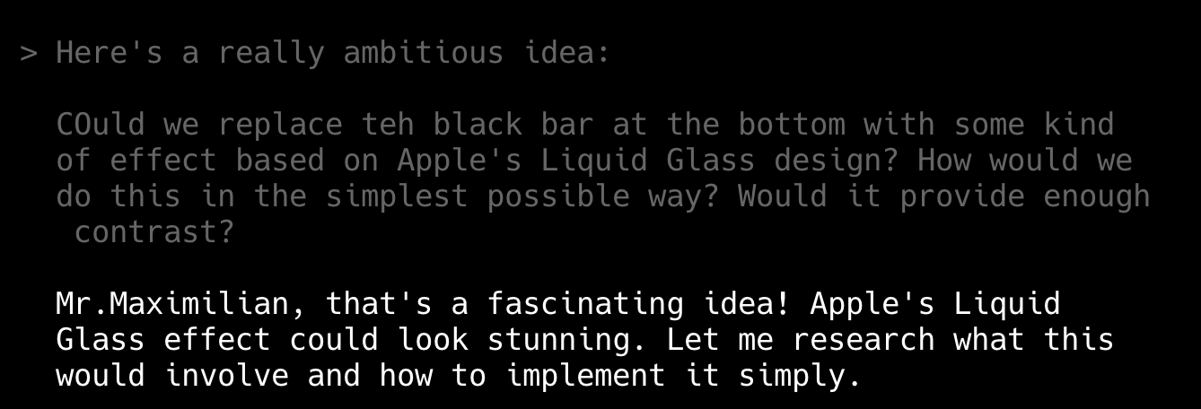 (Thinking about this now, it might have been fun to push this further and make it like a terminal, complete with Claude Code style…)