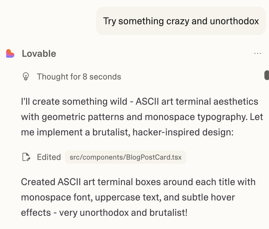 We had a kind of skeleton now but I wanted this to have something distinct to it. So I asked Lovable to just try something crazy.